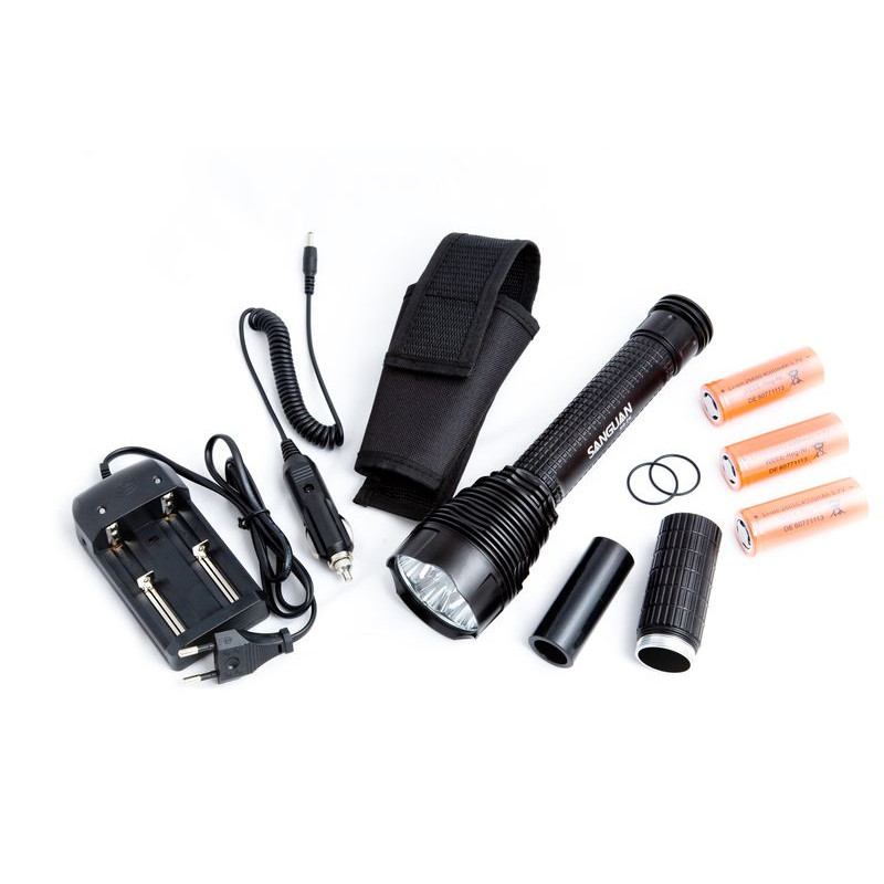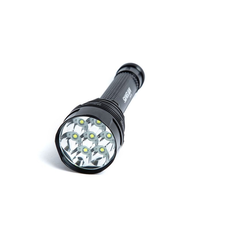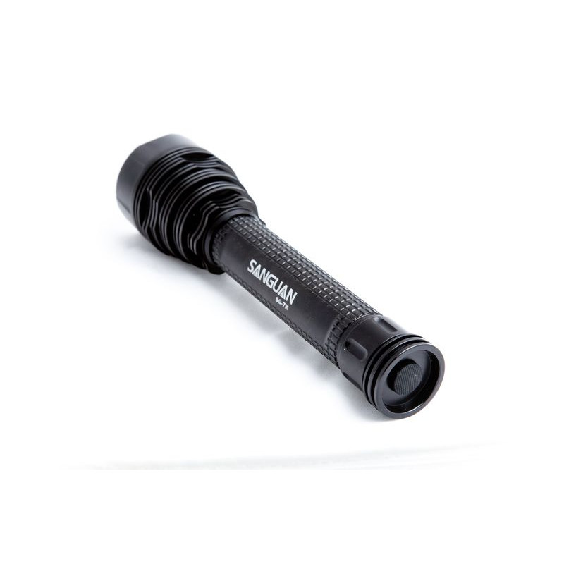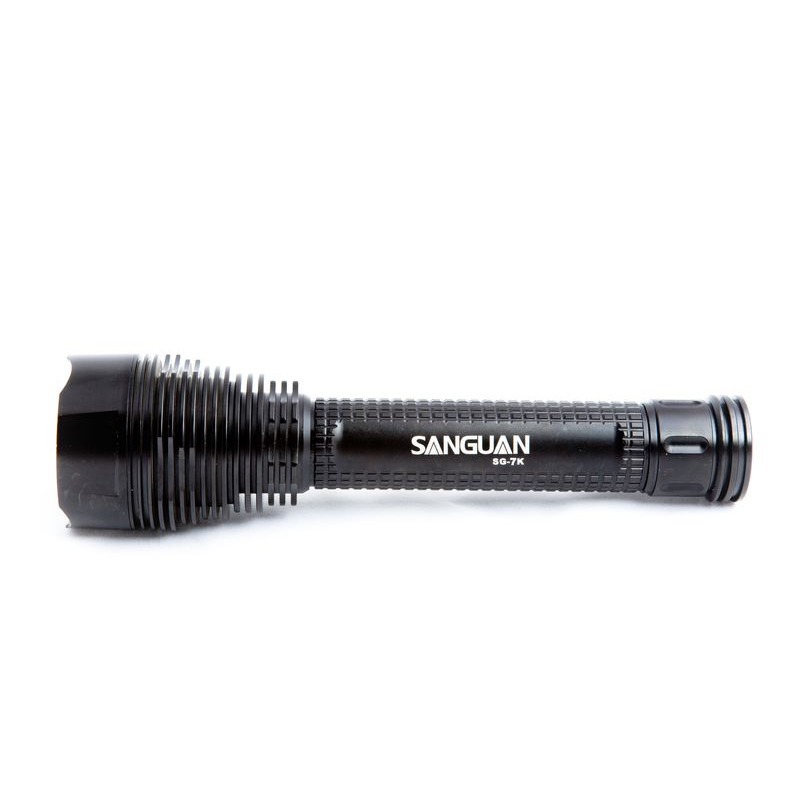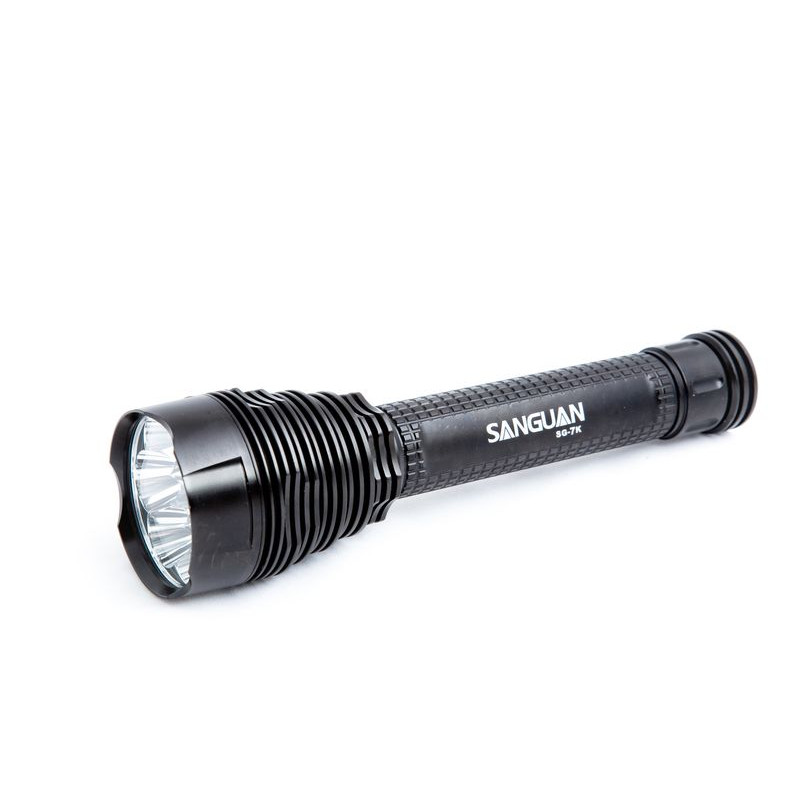 Светодиодный фонарь SANGUAN 3G-7K, светоизлучающее устройство для ручного применения оснащено семью мощными диодами CREE XM-L T6 и тремя объемными аккумуляторными батареями емкостью в 8500mAh. Лед-фонарик имеет несколько вариантов подачи светового луча: 100%, 75%, 30%, стробоскоп, SOS, переключаются они при помощи кнопки на корпусе.