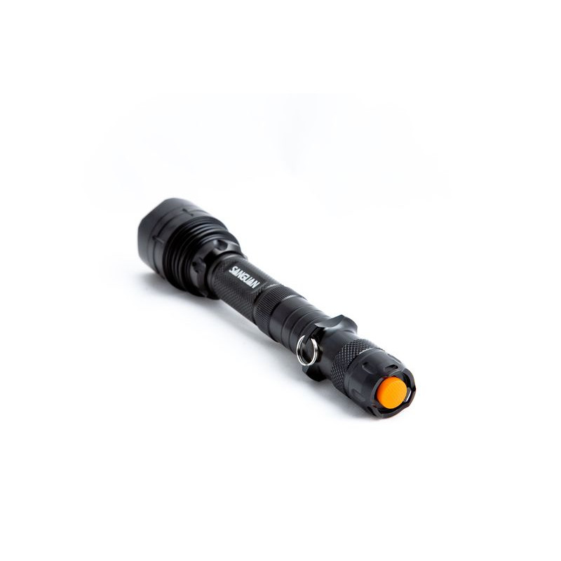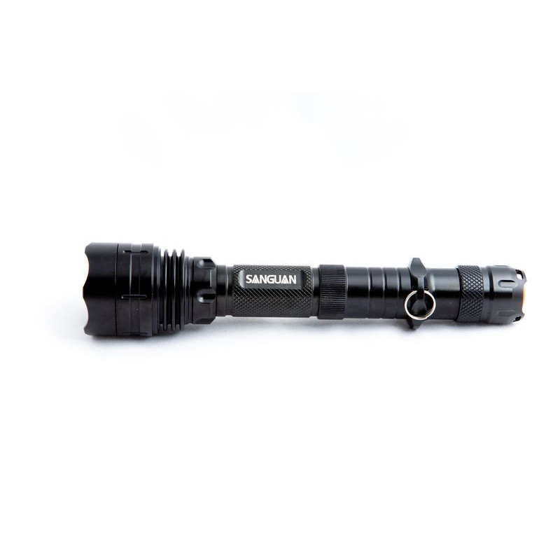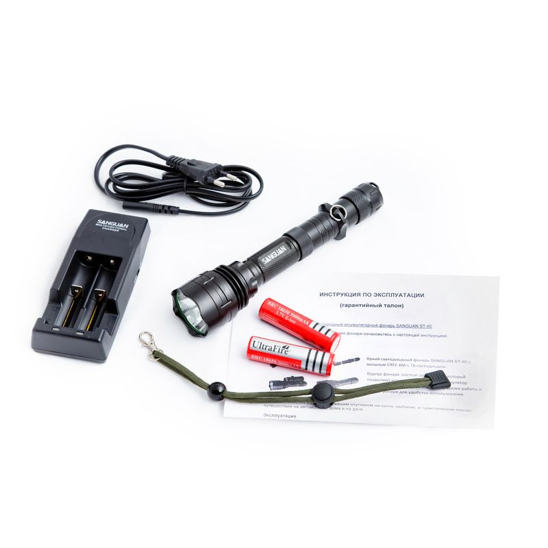 Светодиодный фонарь SANGUAN ST-80. Светоизлучающее устройство для ручного применения оснащен мощным, ярким диодом CREE XM-L T6 и двумя объемными аккумуляторными батареями емкостью в 3000mAh. Лед-фонарик имеет несколько вариантов подачи светового луча: 100%-50%-30%-Сторб, переключаются они при помощи кнопки на корпусе.