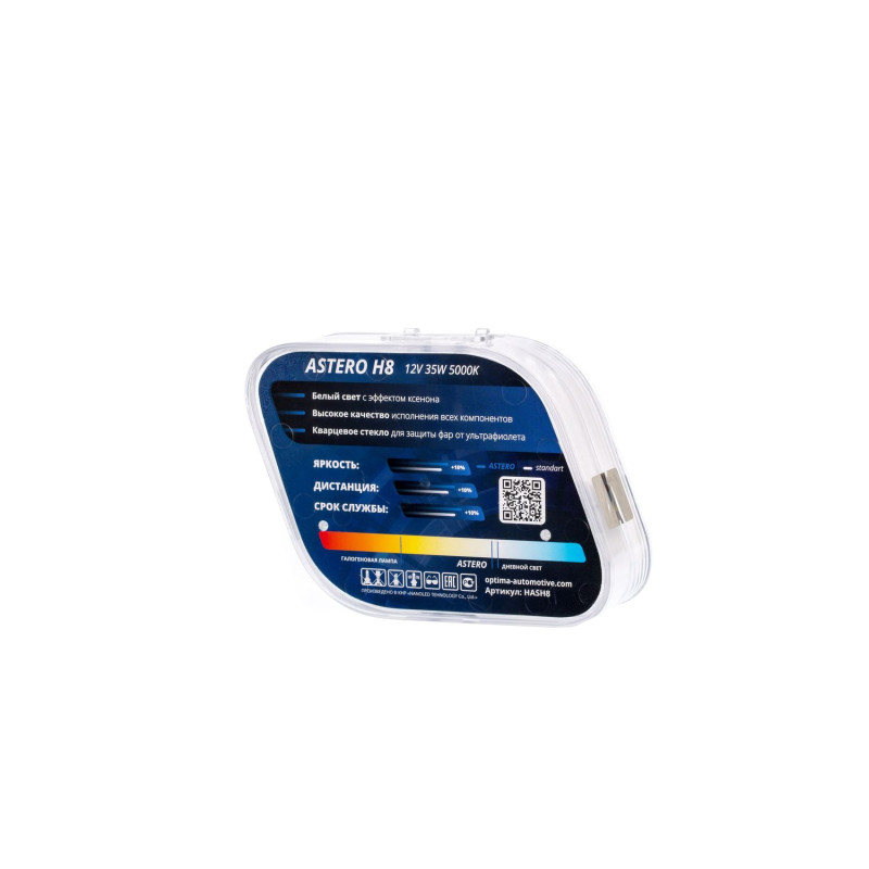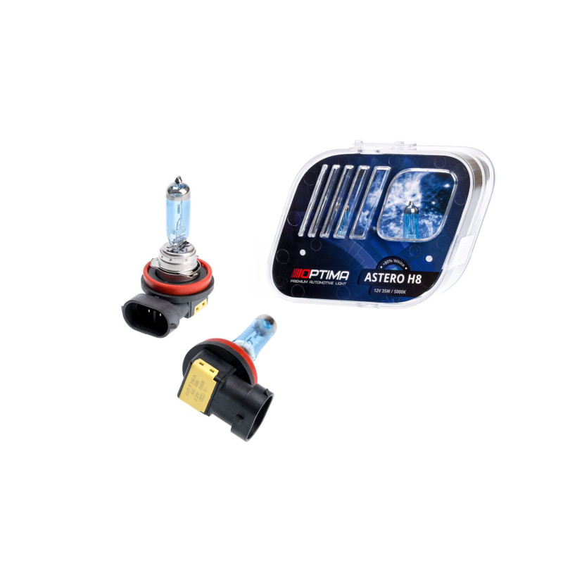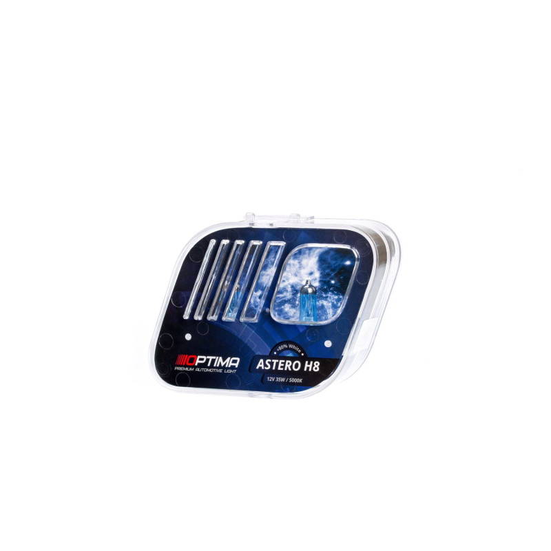Галогенные лампы Optima Astero H8 +80% White 5000K- Откройте для себя высокотехнологичные галогенные лампы Optima Astero, повышенная цветовая температура производит такое же впечатление, как свет стандартных ксеноновых ламп. Свет этой лампы максимально приближен к естественному дневному свету, - это позволяет лучше концентрироваться на дороге и воспринимать контрасты на большом расстоянии, в отличие от стандартных желтых ламп. Современный дизайн с серебристым колпачком делает эту лампу идеальным вариантом для любого вида фар.