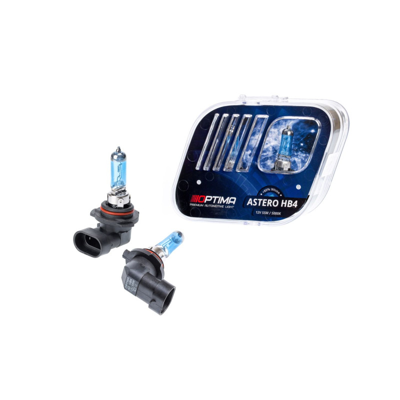 Галогенные лампы Optima Astero Hb4 +80% White 5000K- Откройте для себя высокотехнологичные галогенные лампы Optima Astero, повышенная цветовая температура производит такое же впечатление, как свет стандартных ксеноновых ламп. Свет этой лампы максимально приближен к естественному дневному свету, - это позволяет лучше концентрироваться на дороге и воспринимать контрасты на большом расстоянии, в отличие от стандартных желтых ламп. Современный дизайн с серебристым колпачком делает эту лампу идеальным вариантом для любого вида фар.