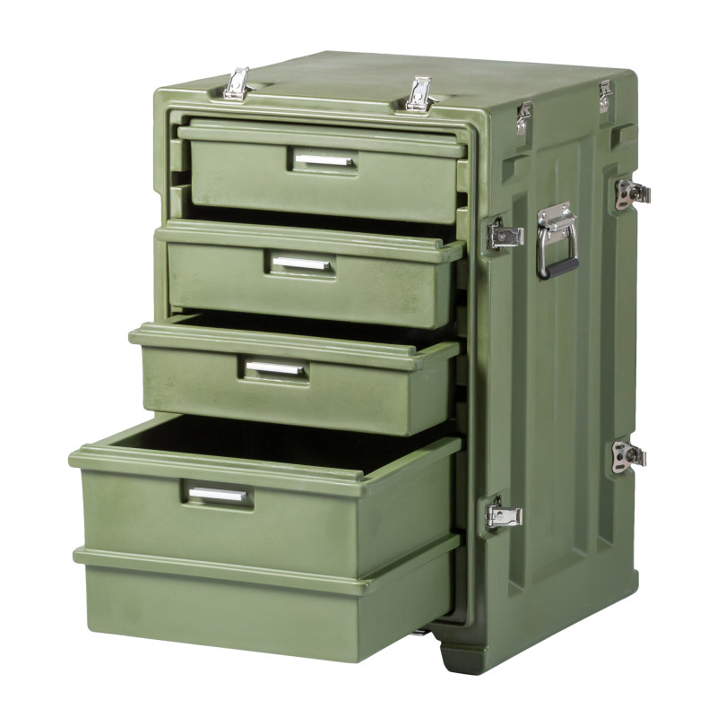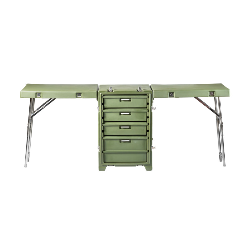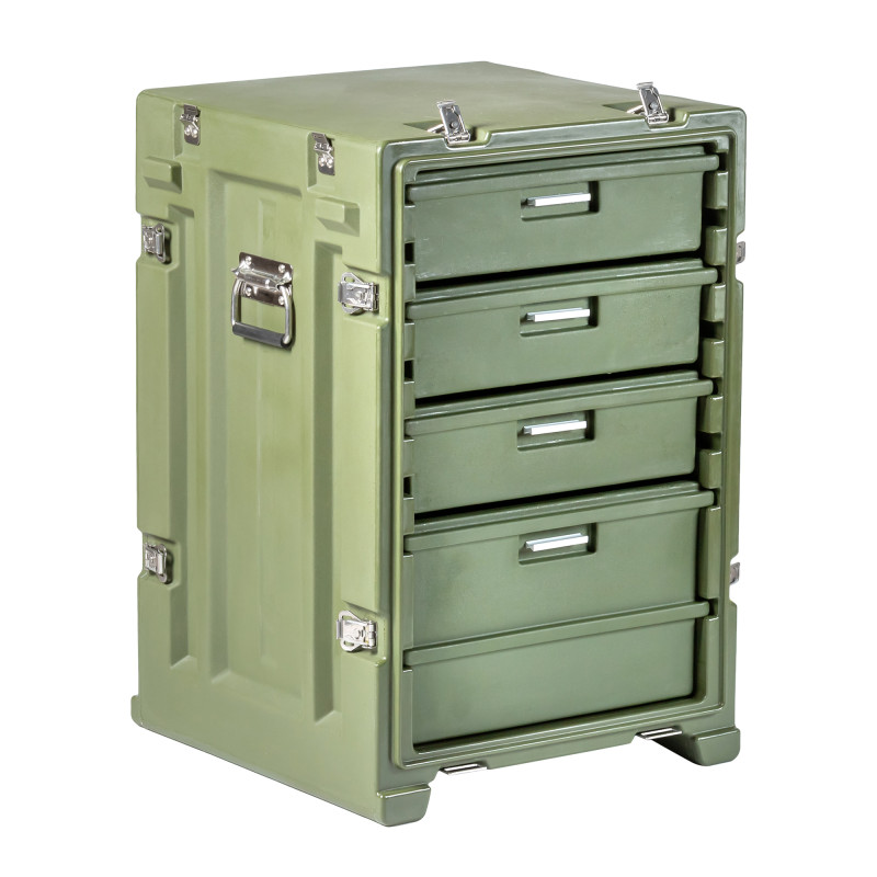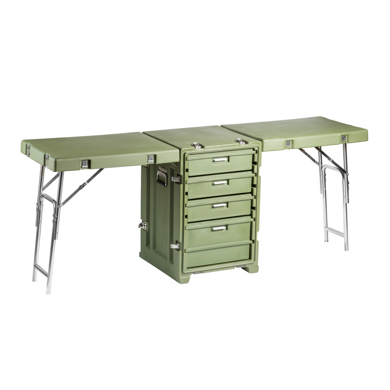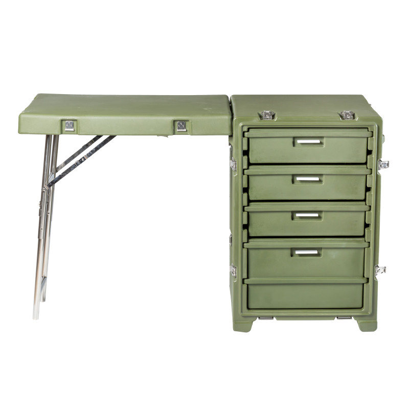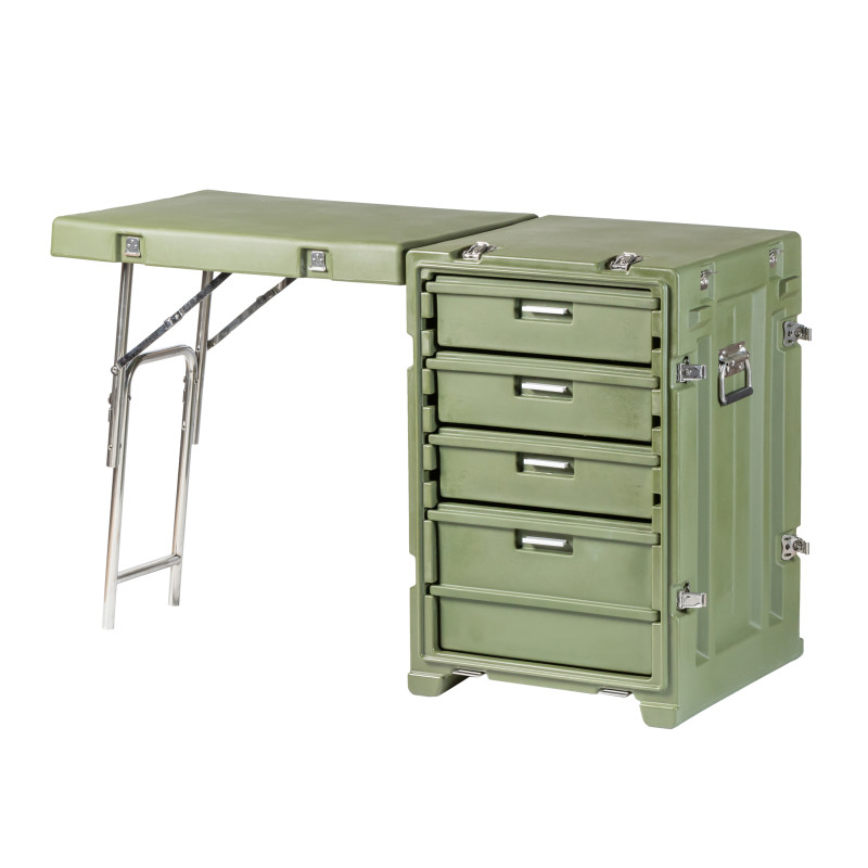Стол выполнен из LLDPE - Линейный полиэтилен низкой плотности, материал обладает повышенный прочностью и стойкостью к температурам. На тумбе установлены надежные металлические замки с проушинами для замка или пломбы. Герметичное соединение с неопреновой прокладкой обеспечивают защиту содержимого от влаги и пыли. Кейс оснащен воздушным клапаном для выравнивания деления.