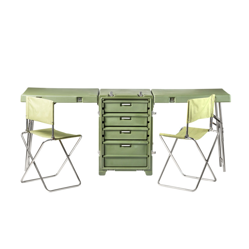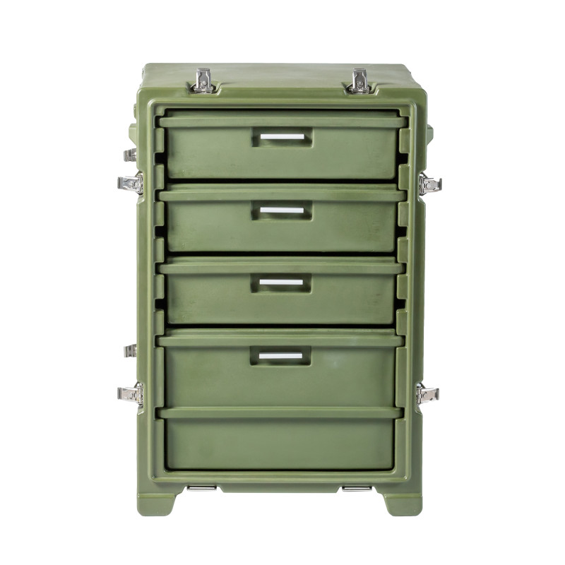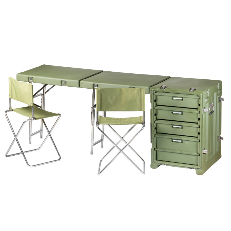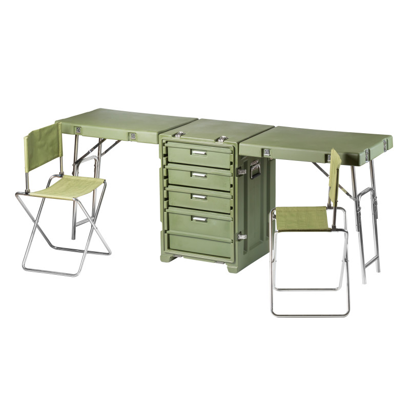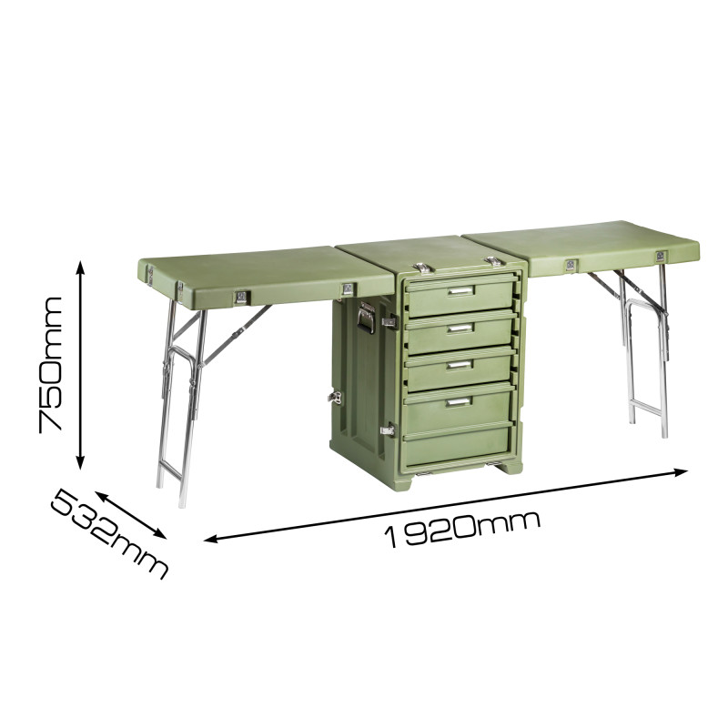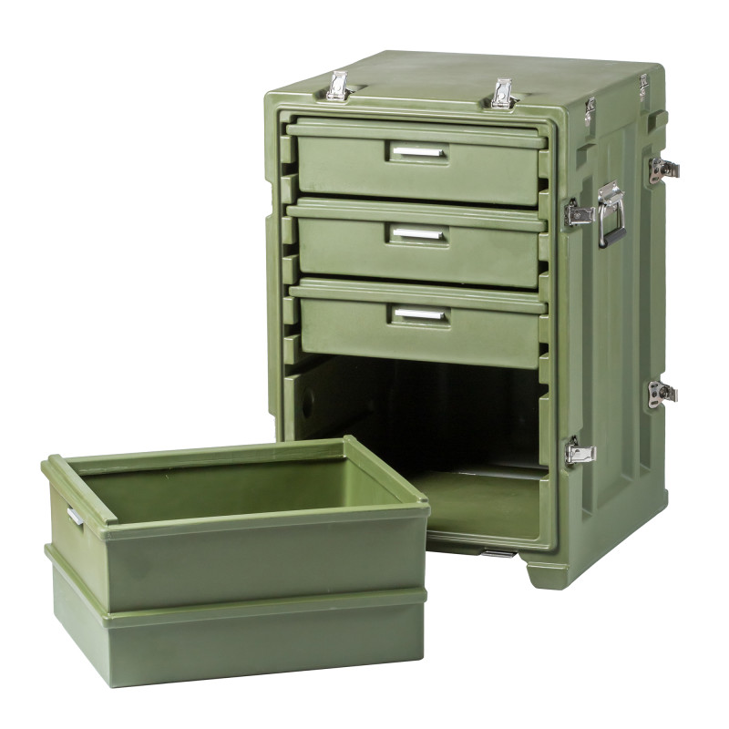 Стол выполнен из LLDPE - Линейный полиэтилен низкой плотности, материал обладает повышенный прочностью и стойкостью к температурам. На тумбе установлены надежные металлические замки с проушинами для замка или пломбы. Герметичное соединение с неопреновой прокладкой обеспечивают защиту содержимого от влаги и пыли. Кейс оснащен воздушным клапаном для выравнивания деления.