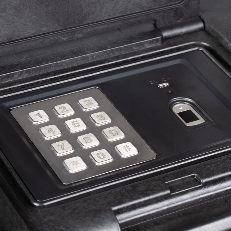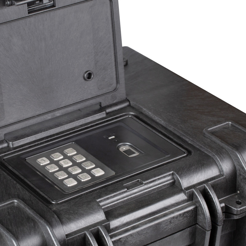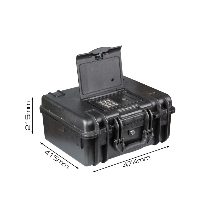 Кейс СЕЙФ с замком: Отпечаток, Пароль, Ключ. Корпус из сталь объем 29,21л