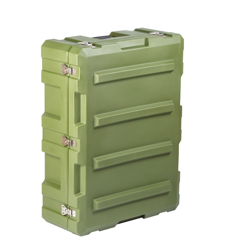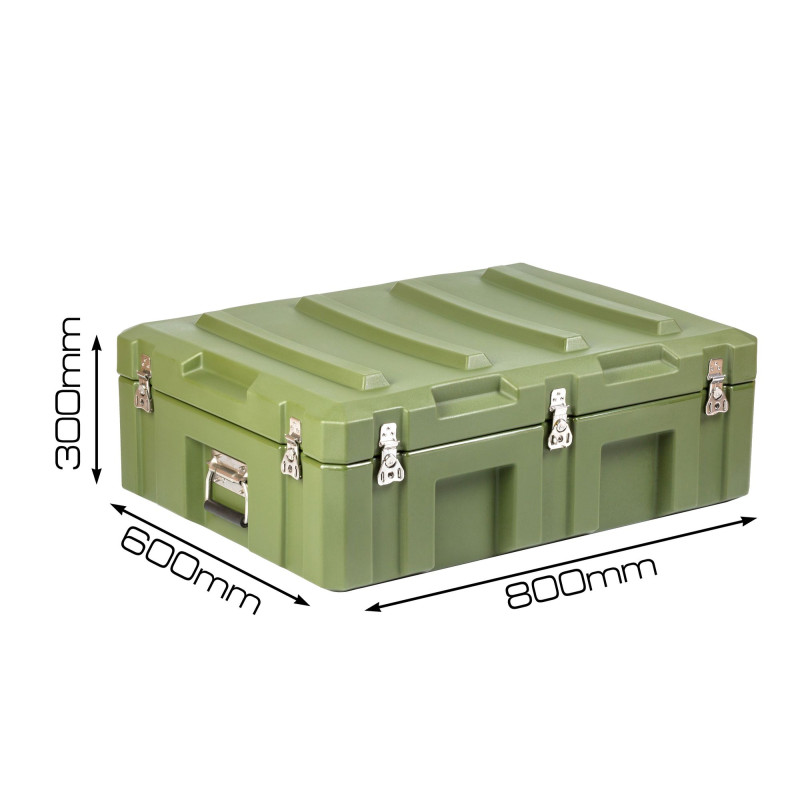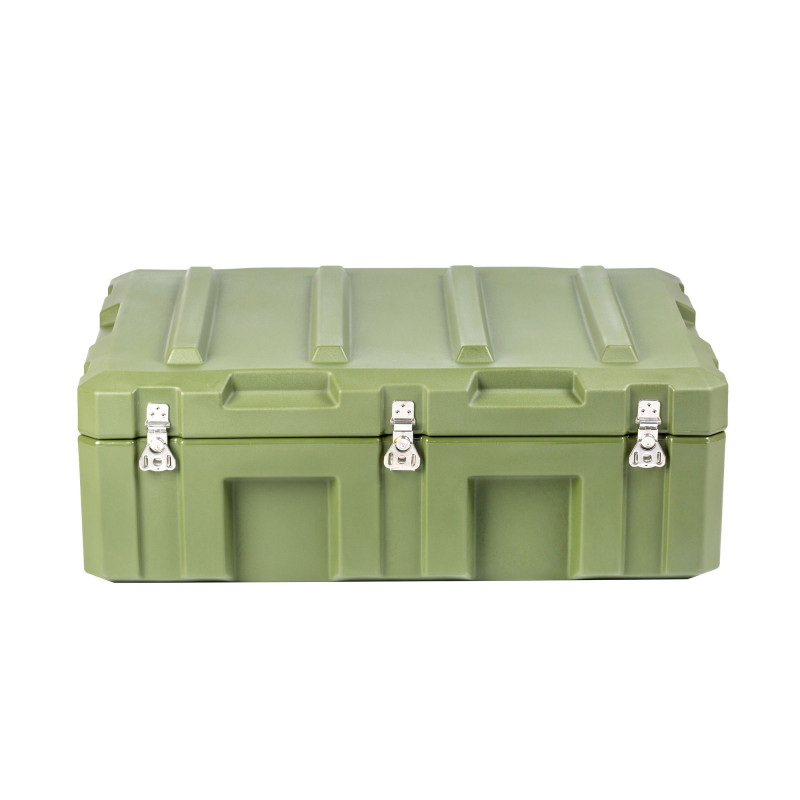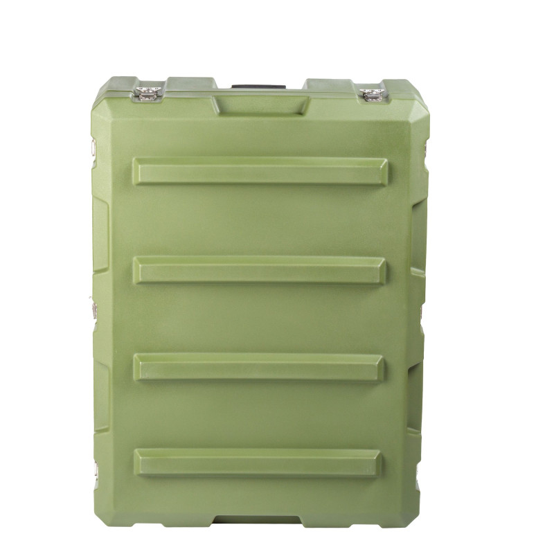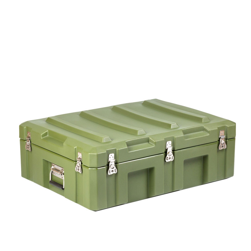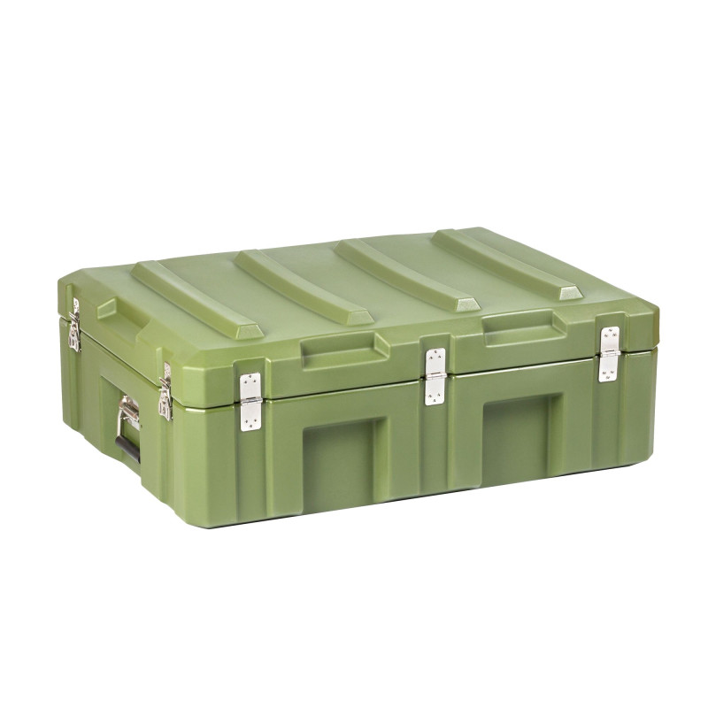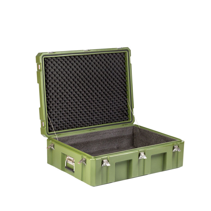 Транспортировочный кейс выполнен из LLDPE - Линейный полиэтилен низкой плотности, материал обладает повышенный прочностью и стойкостью к температурам. На кейсе установлены надежные металлические замки с проушинами для замка или пломбы. Ребра жесткости обеспечивают дополнительную прочность. Герметичное соединение с неопреновой прокладкой обеспечивают защиту содержимого от влаги и пыли. Кейс оснащен воздушным клапаном для выравнивания давления.