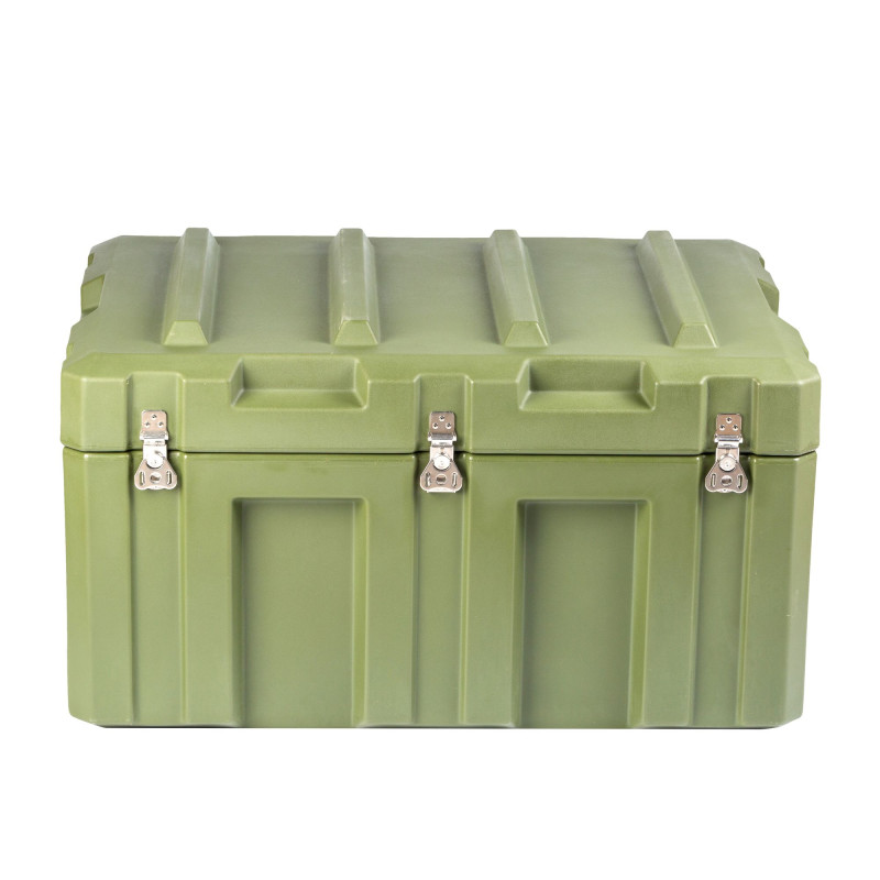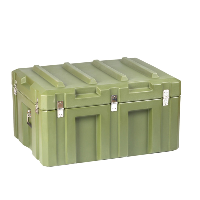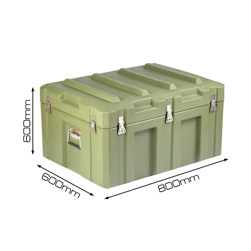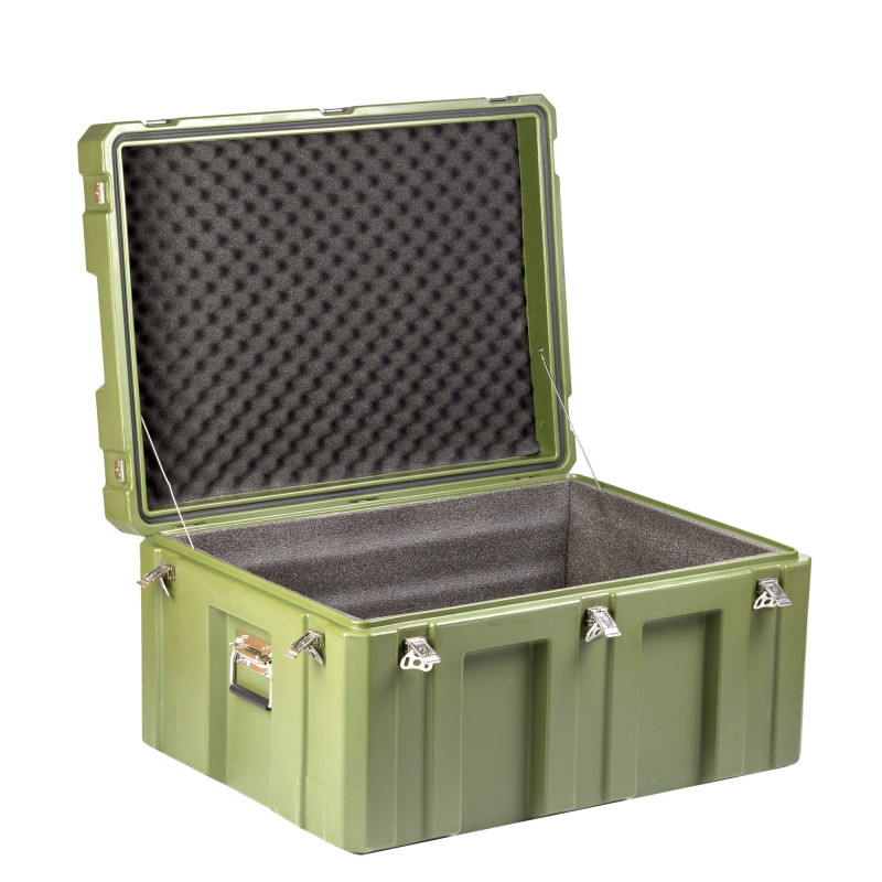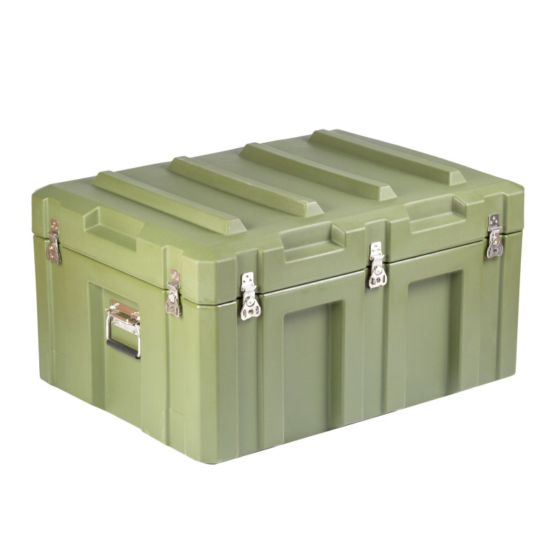 Транспортировочный кейс выполнен из LLDPE - Линейный полиэтилен низкой плотности, материал обладает повышенный прочностью и стойкостью к температурам. На кейсе установлены надежные металлические замки с проушинами для замка или пломбы. Ребра жесткости обеспечивают дополнительную прочность. Герметичное соединение с неопреновой прокладкой обеспечивают защиту содержимого от влаги и пыли. Кейс оснащен воздушным клапаном для выравнивания давления.