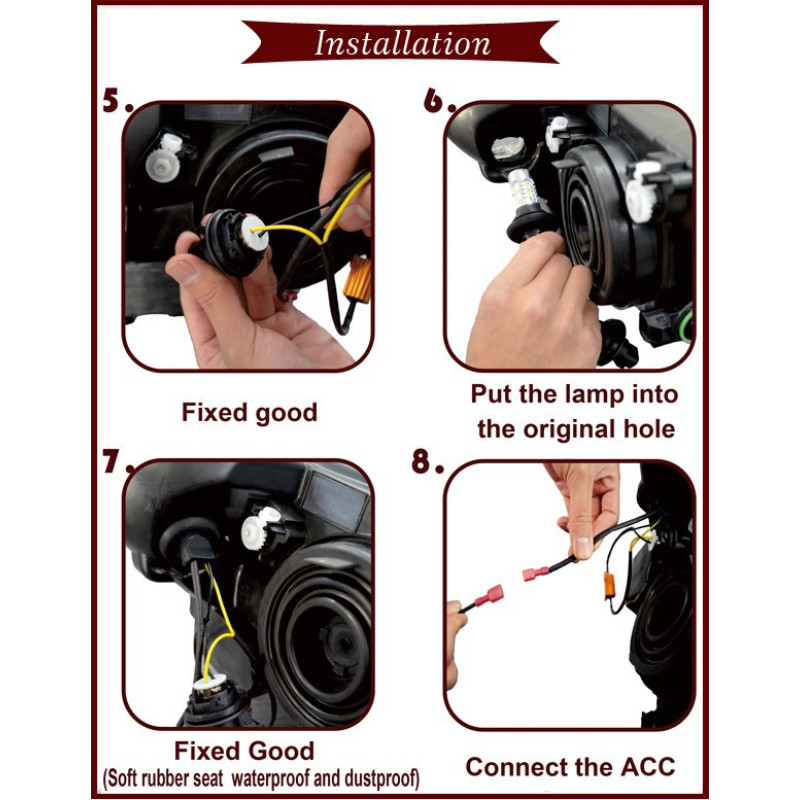 Лампа предназначена для установки в фару, где цоколь одевается на лампу а не лампа ставится в патрон крышки фары. При желании лампу можно установить в патрон который расположен в крышке фары с небольшой доработкой. Для работы дневных ходовых огней, необходимо подключить их к габарита или к разъему на который податься плюс при включении зажигания.