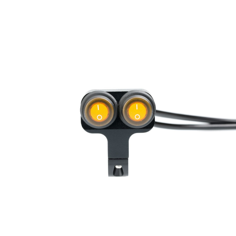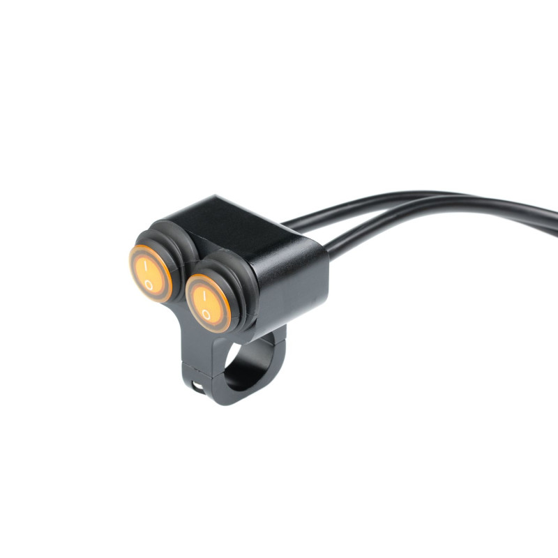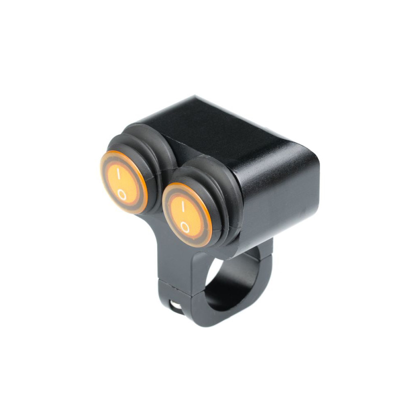 Выключатель влагозащищенный 2220BUB 2х кнопочный черный, водонепроницаемость IP-65. При выборе выключателя в мотоцикл, квадроцикл, яхту или другое транспортное средство с открытым кузовом, наиболее важными параметрами являются надежность в эксплуатации и степень герметичности корпуса. Как показывает практика, лучшим решением станут герметичные выключатели, которые могут крепиться как на руль, так и на другие элементы управления. Особенности: Выключатель влагозащищенный 2220BUB черного цвета - это эргономичный элемент управления дополнительными функциями автомобиля с двумя фиксирующимися кнопками; Для лучшего ориентирования в ночное время суток, во включенном состоянии клавиши подсвечиваются желтым цветом; Крепится выключатель при помощи хомута с отверстием D=22 мм на руль, штурвал или трубку соответствующего диаметра; Для подключения к бортовой сети транспортного средства предусмотрены двухжильные медные провода длиной 30 см каждый. Выключатель влагозащищенный двухкнопочный модель 2220BUB кнопки 2х позиционные (выкл/вкл). Клавиши в положении "вкл." - подсвечиваются желтым светом Кнопки установлена в дюралюминиевый корпус, для обеспечения влагозащиты полость корпуса заполнена компаундом Цвет корпуса - Черный Цвет клавиш - Желный Диаметр отверстия под трубу – D22 мм Длина провода – 30см Цена указана за 1 шт. арт: NL-KN-2220BUB
