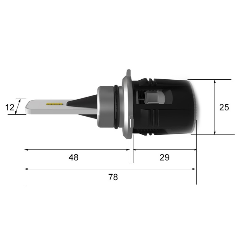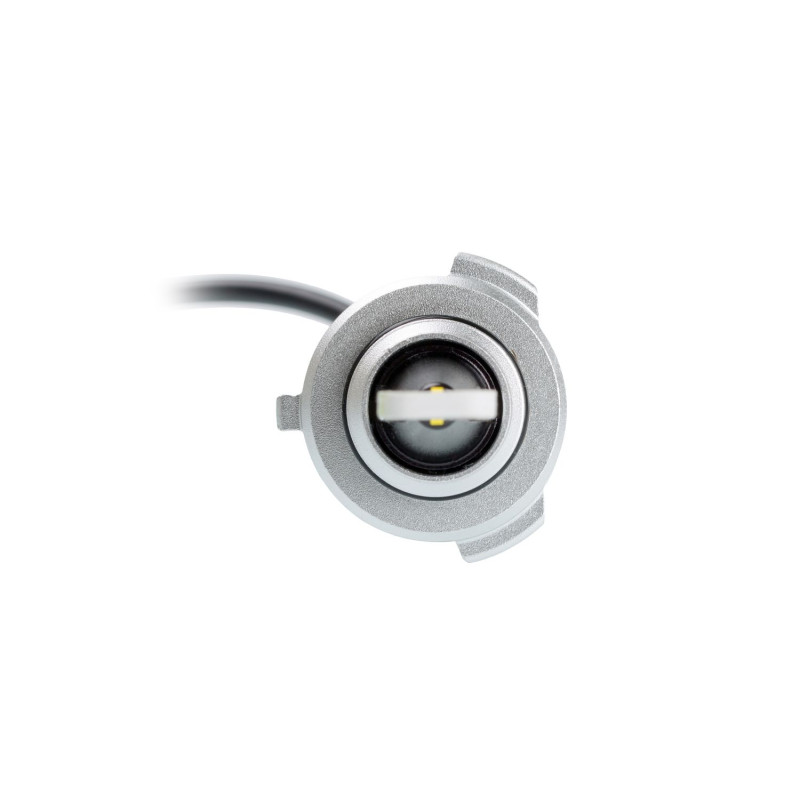 Тонкий радиатор из анодированного алюминия позволяет разместить светодиодные чипы максимально близко и сохранить фокусном расстоянии штатной лампы.