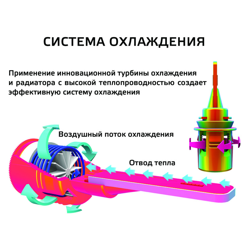 Инновационная турбина охлаждения и радиатора с высокой теплопроводностью создает эффективную систему охлаждения.