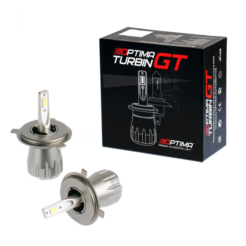 Светодиодная лампа H4 Optima LED Turbine GT, 4000Lm на лампу, 9-32V применяется для установки на легковой, грузовой автотранспорт и мототехнику для эффективной замены менее производительных и долговечных галогеновых аналогов. LED-лампа рассчитана на монтаж под цоколь H4 и может устанавливаться в системы головного света. Световой поток яркостью 4000 Лм. Расположение светодиодов полностью имитирует расположение нитей накаливания, создавая отличную фокусировку и многократно превосходя галогеновые аналоги по качеству, а также дальности.