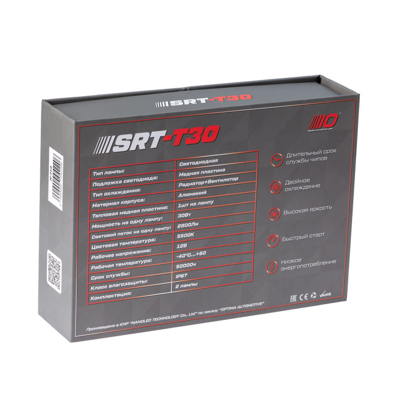 Светодиодная лампа Optima Premium серии SRT-T30 с цоколем H1. Светодиоды расположены на медной подложке, которая обеспечивает эффективное отведения тепла от них к радиатору, обдуваемому вентилятором, что гарантирует стабильную и долгую работу лампы в любых условиях. Яркость 2800люмен и мощность 30Вт от одной лампы. В конструкции лампы использованы влаго-пылестойкие вентиляторы которые позволяют устанавливать лампы в фары, на которых нету защитных крышек.