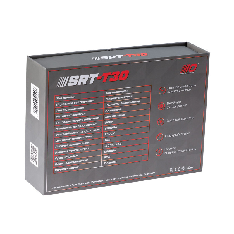Светодиодная лампа серии SRT-T30 с цоколем H7. Светодиоды расположены на медной подложке, которая обеспечивает эффективное отведения тепла от них к радиатору, обдуваемому вентилятором, что гарантирует стабильную и долгую работу лампы в любых условиях. Яркость 2800люмен и мощность 30Вт одной лампы. В конструкции лампы использованы влаг пыле стойкие вентиляторы которые позволяют устанавливать лампы в фары, на которых нету защитных крышек.