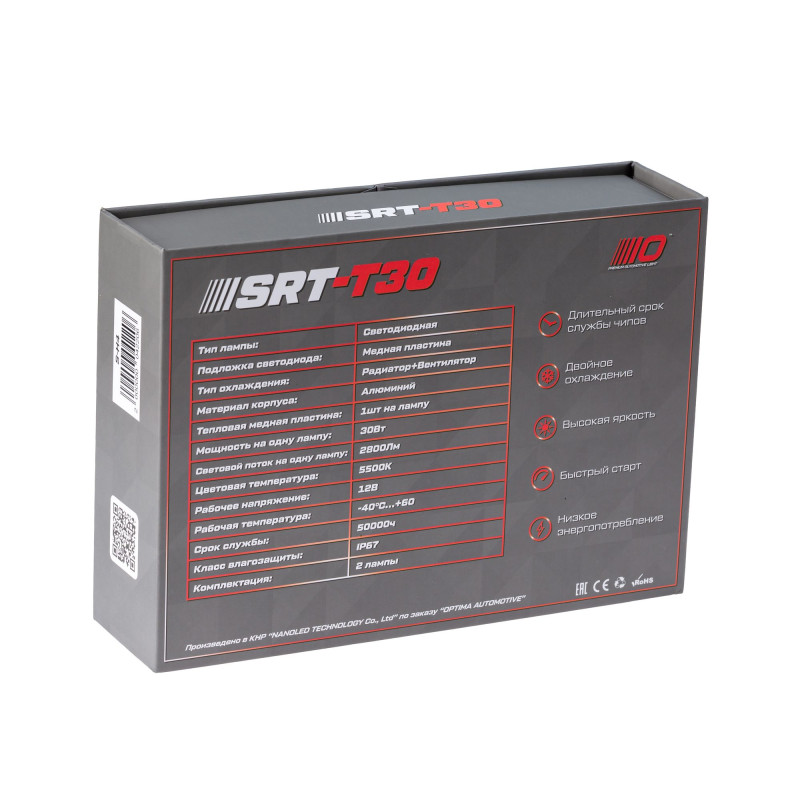 Светодиодная лампа серии SRT-T30 с цоколем HB3. Светодиоды расположены на медной подложке, которая обеспечивает эффективное отведения тепла от них к радиатору, обдуваемому вентилятором, что гарантирует стабильную и долгую работу лампы в любых условиях. Яркость 2800люмен и мощность 30Вт одной лампы. В конструкции лампы использованы влаг пыле стойкие вентиляторы которые позволяют устанавливать лампы в фары, на которых нету защитных крышек.