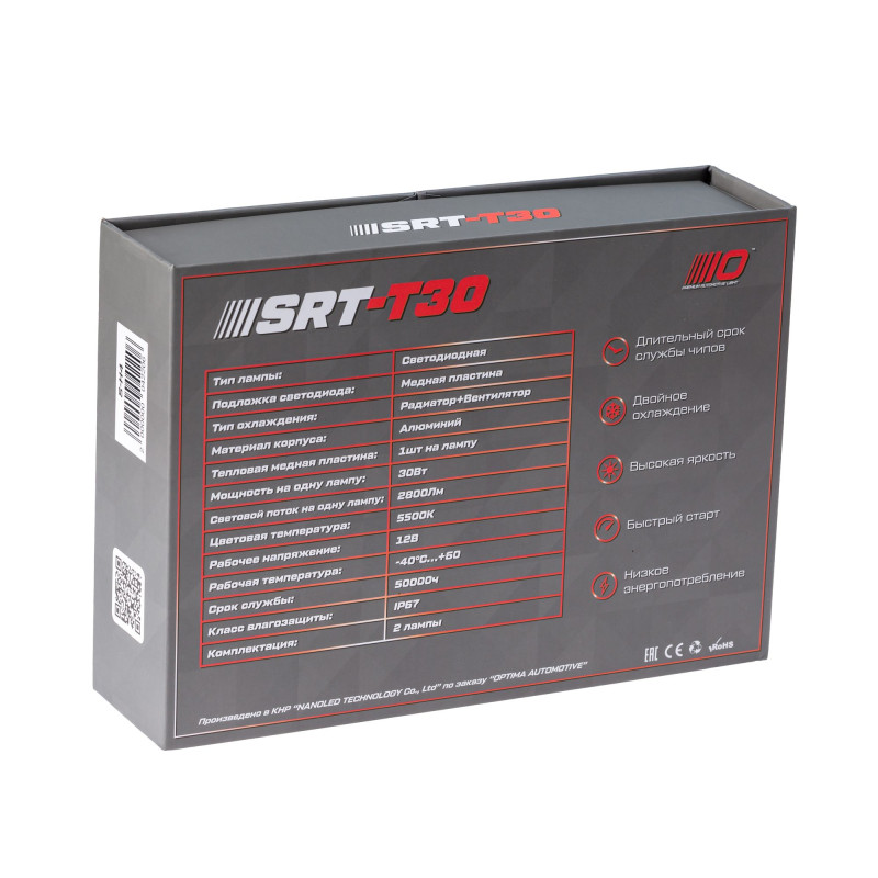 Светодиодная лампа серии SRT-T30 с цоколем HB4. Светодиоды расположены на медной подложке, которая обеспечивает эффективное отведения тепла от них к радиатору, обдуваемому вентилятором, что гарантирует стабильную и долгую работу лампы в любых условиях. Яркость 2800люмен и мощность 30Вт одной лампы. В конструкции лампы использованы влаг пыле стойкие вентиляторы которые позволяют устанавливать лампы в фары, на которых нету защитных крышек.